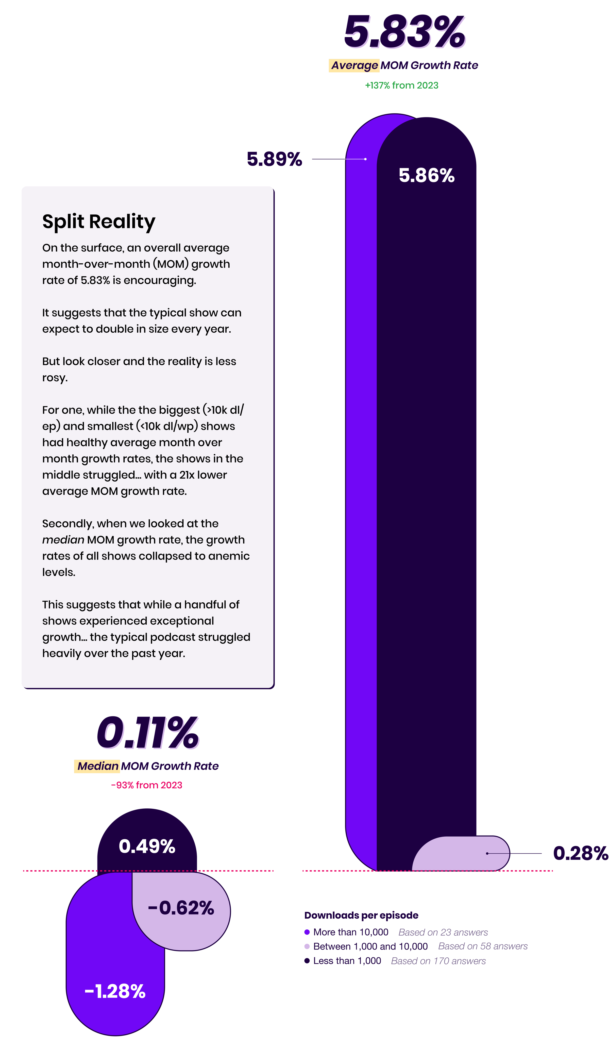 What this tells us is that while a handful of shows are experiencing exceptional growth and pulling the average way up, the typical (or median) podcast has struggled more heavily over the past year.
