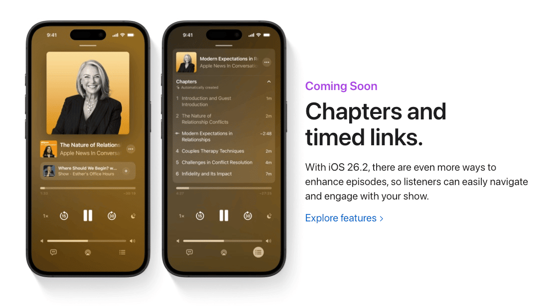 They’re officially rolling out support for chapters. Timestamps that break your episodes into labeled sections listeners can see and skip between directly in Apple Podcasts.